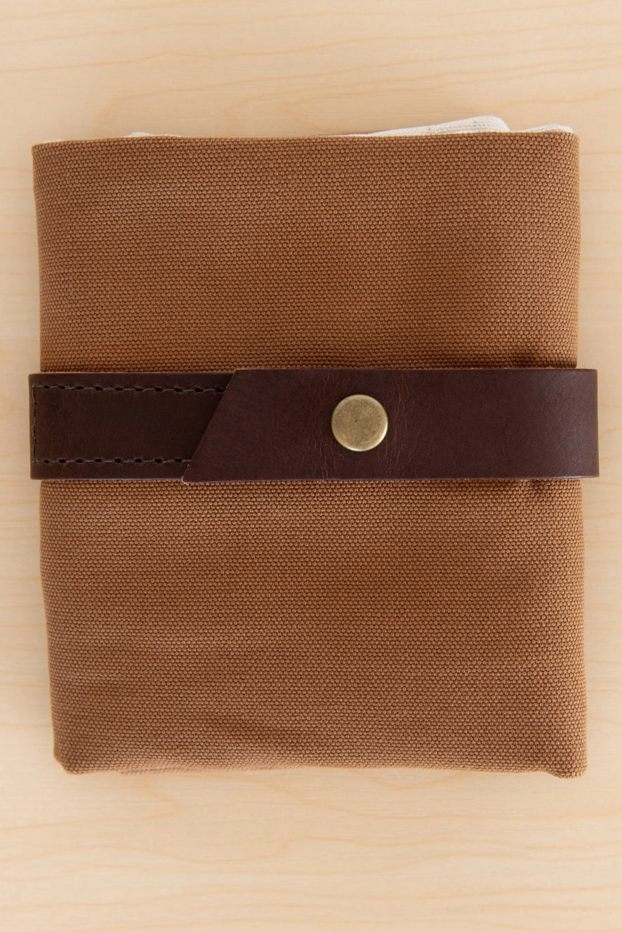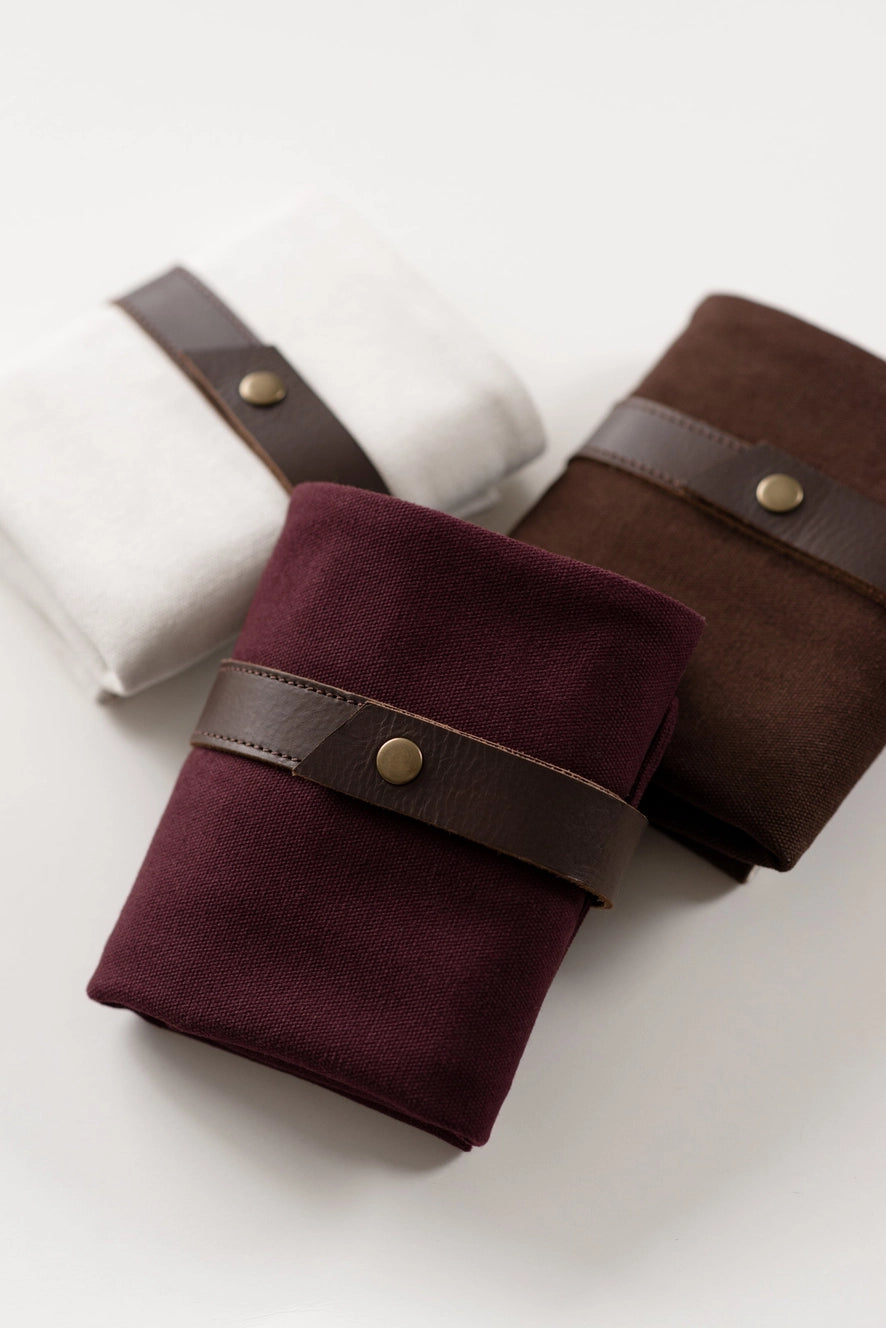 Cases fold in half, then in three to a compact 5" x 6" rectangle secured with a leather strap and sturdy snap, making it a compact utility to stow away in larger knitting bags.